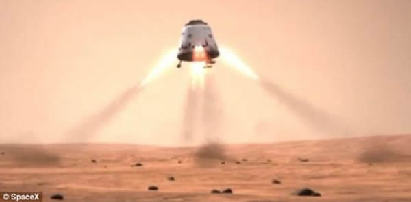 据马斯科说,移民火星的第一步将是把人类送上火星,他希望这项壮举可以通过SpaceX的“龙”飞船在未来15到20年间完成,这张图画显示的是它下降的画面