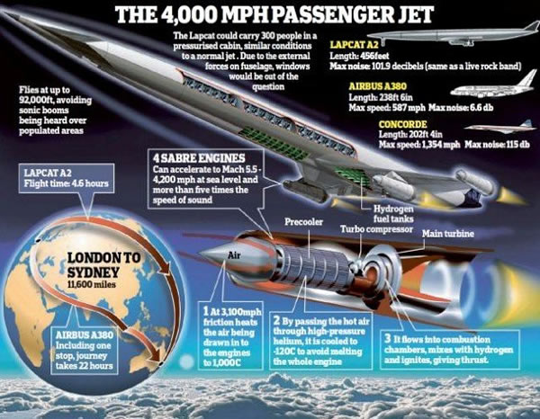 喷气式飞机的发明曾被认为是航空史上的最伟大的突破,来自英国航空专家最近公布了一款最新的发动机,装备这款发动机的飞机能够以每小时4000英里的速度在5小时内从伦敦飞到悉尼。早些时候,这款新型发动机获得了欧洲太空总署的批准,它的创造者认为这是革命性的设计,这款发动机也能够被用于发射人造卫星,而它的成本仅为现有火箭发动机成本的一小部分。