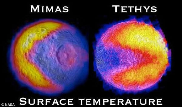 在土卫三“特提斯”的地表温度图中,美国宇航局的科学家发现了吃豆人图案。两年前,他们也曾在土卫一“米玛斯”的图像中发现这种图案土卫三表温图使用的数据来自于“卡西尼”号的合成红外分光计。科学家温差可能与地表物质不同所致。图像中,亮度较高的区域可能获取更多热量。