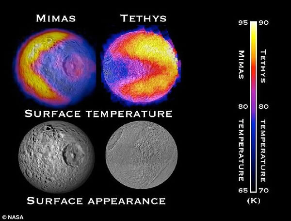 曾对土卫一地表温度数据进行分析的科学家表示,温差可能因土卫一环绕土星运行时高能电子“轰炸”这颗卫星导致。这种“轰击”将地表部分区域变成结构紧密的冰,这种变化导致所在地区白天时温度不会迅速升高,夜晚时则温度骤降。