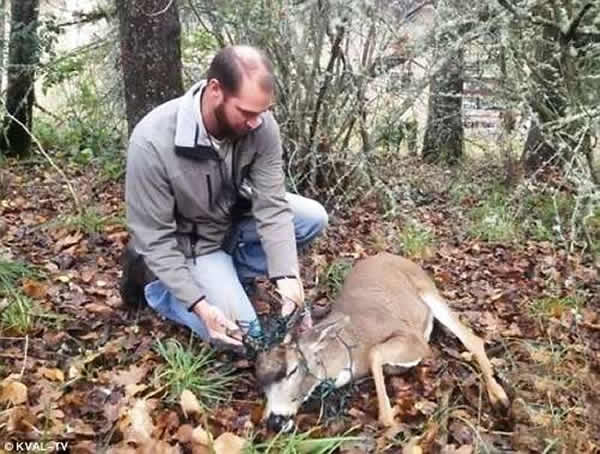 据报道,日前美国俄勒冈州的野生动物管理部门接到报告,称有人目击一只野鹿被圣诞节灯饰紧紧缠住脖子。工作人员随即和野生生物学家布莱恩一起开始搜寻,当找到这只鹿时,它已经因为脖子被缠得太紧而几乎窒息。