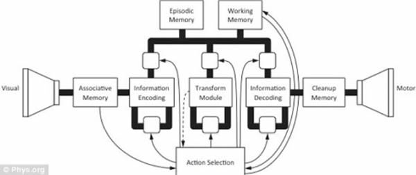 Spaun的大脑由250万个神经元组成,它分解成一串模拟头盖骨子系统,其中包括前额皮质、基底神经节和丘脑,它们通过模拟神经元连接在一起,精确模拟真正的人类大脑的线路布局。这种模拟大脑的基本概念,是努力让这些子系统的行为很像真正的大脑:视觉输入经过丘脑处理,最终数据被储存在神经元里,然后基底神经节向一部分皮层发送任务指令。所有这些计算结果都是通过精确的生理学模拟进行的,模仿电压尖脉冲和神经传递素。Spaun甚至模拟了人类大脑的局限性,努力储存更多短期记忆,而不是少量记忆。从机械学上来说这个模拟大脑非常简单,但是它的变通能力非常惊人。