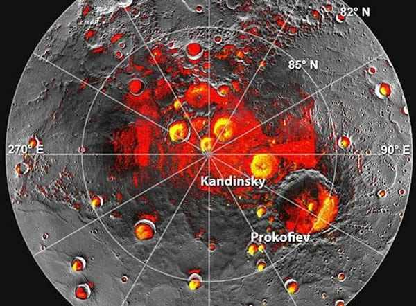 水星北极。图像中的红色区域标示出了水星北极地区迄今在所有信使号观测图像中均没有光照涉及的永久阴影区。黄色区域则是地基雷达观测显示出的高反射明亮区域,可以看出两者之间的吻合度