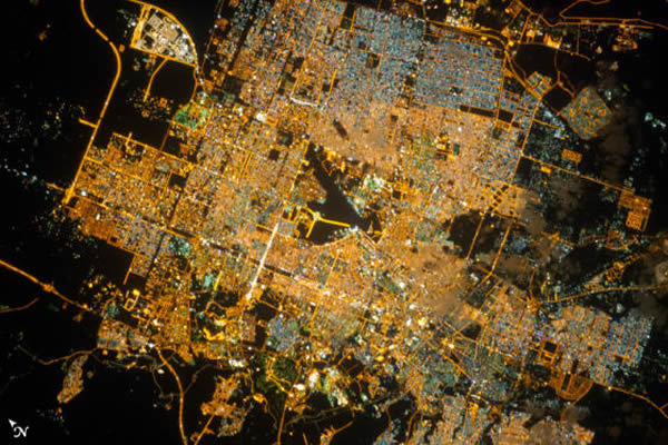 这幅照片是国际空间站上的宇航员于2012年11月13日拍摄的。与白天拍的照片相比,夜晚拍的照片显示了更多的城市细节。