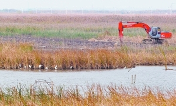 南汇东滩湿地,一群白鹭在芦苇下歇息捕食,远处一台挖掘机在开垦湿地。