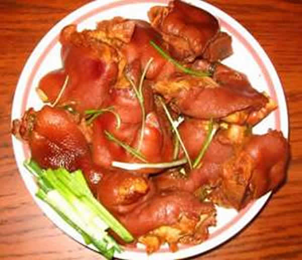 彝族风味菜,即肉冻。这是彝族地区较为讲究的一种菜肴。它采用猪蹄和肘子制做而成。一般做法是将肉放入锅内煮软后捞起,剔去骨头并将肉宰碎,放上木姜、生姜、花椒等佐料,有的还放橘子皮,或鸡蛋之类的东西,然后放回锅里煮上一阵,以便使佐料渗入肉中,最后放入木钵内,放上一夜即成。肉冻柔软可口,香味独特,是彝族十分喜爱的一种食品。