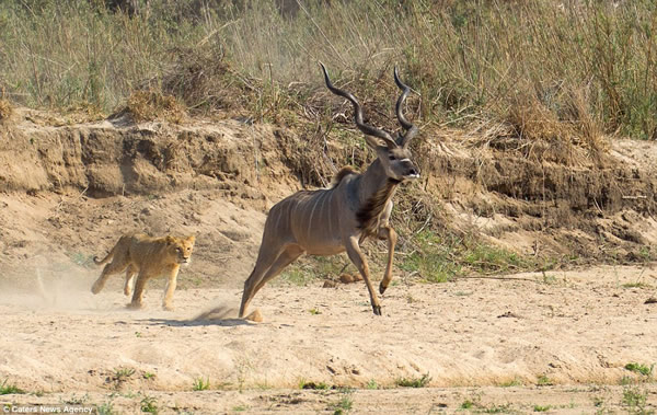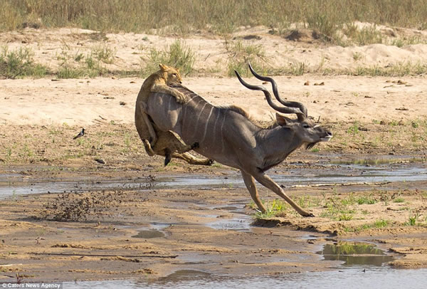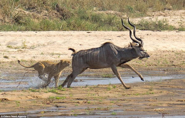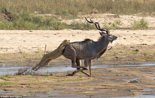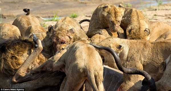 在南非玛拉玛拉野生动物保护区,一只冲进狮群埋伏圈的大弯角羚由于逃跑时受到一只母狮的拖绊,导致它最终被狮群包围,并沦为它们美餐。摄影师盖里•希尔(Gary Hill)拍摄到了这一惊心动魄的场面。