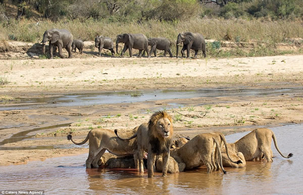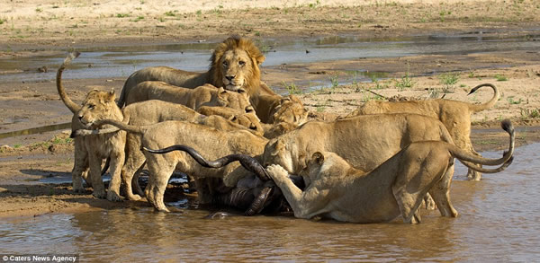 希尔称,当时,他们共看见19只狮子埋伏在空旷的河岸边。其中两只母狮子忽然朝陡峭的岸边走去,消失在他们的视线中。