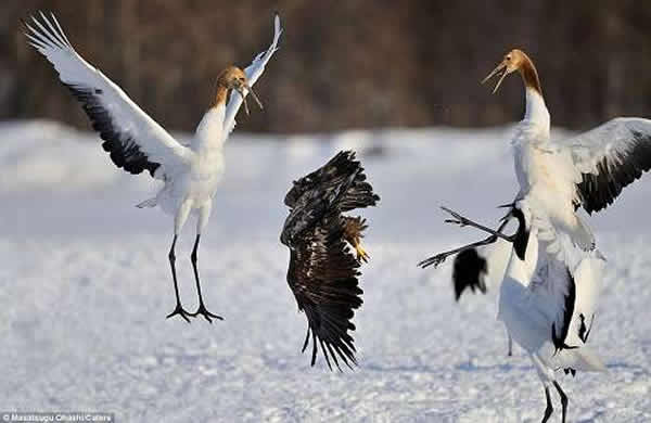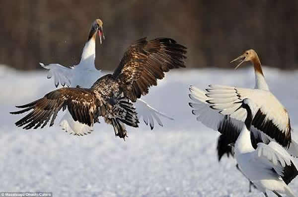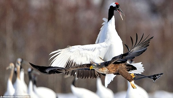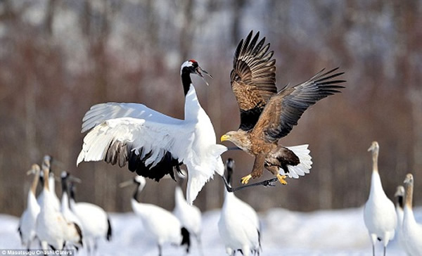 最终,老鹰还是不敌丹顶鹤,败北飞走。
