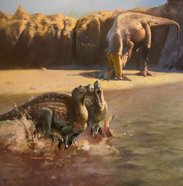 In an artist's rendering, Sauroniops feeds on a young Spinosaurus while other Spinosaurus run nearby.