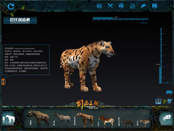 《剑齿王朝》是科技馆界第一部具有自主知识产权的原创影片,由华东科普影视资源开发联盟成员上海科技馆、山东省科技馆、广西科技馆等合作完成的又一部四维巨作。全片总长20分钟,共制作了260个镜头,毛发特效镜头200多个,每个角色的毛发量平均在100万根,4D特效种类设计近20种,平均不到一分钟有一处4D特效表现。