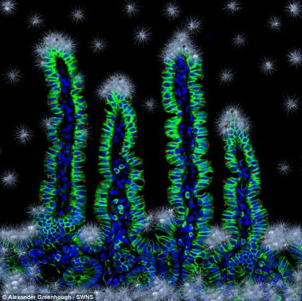 据英国每日邮报报道,这张图像看上去犹如冬季仙境,但事实上是显微镜下人体肠壁上的细胞。