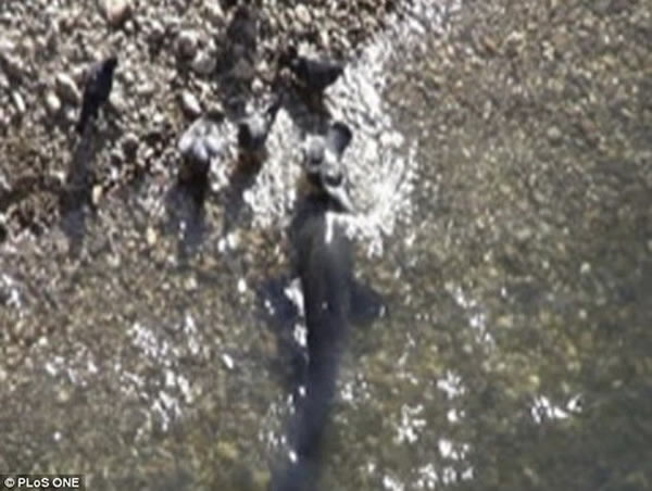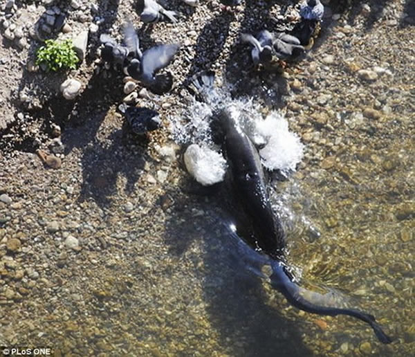 从视频图像中可清晰地看到这些鲶鱼能够潜伏在岸边突然攻击鸽子,之后紧紧咬住鸽子将它们拉入水中吞食。这种不同寻常的特征此前从未观测到。