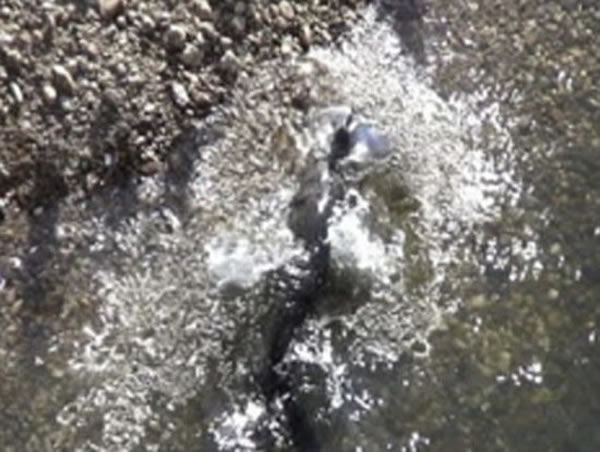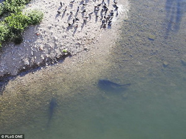 研究人员进行了5个月的观测,发现法国西南部塔姆河中的鲶鱼擅长岸边捕食鸽子。图中是两条鲶鱼正在悄悄地接近岸边的鸽子