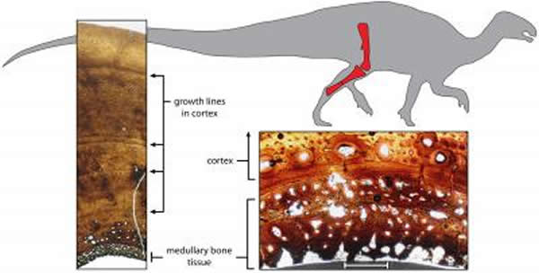 一具1.2亿年前的雌性腱龙骨骼的胫骨横截面,它显示出生长环以及即将产卵前在骨髓腔中出现的髓骨。这个个体在8岁时死亡,距离她有能力产卵为时不远。