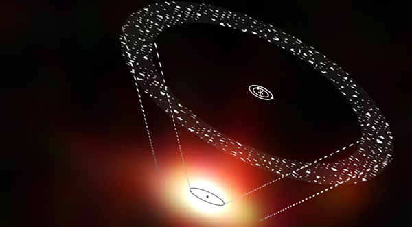 This artist's impression shows the orbits of planets and comets around the star 61 Vir, superimposed on a view from the Herschel Space Telescope. Image credit: ESA/AOES