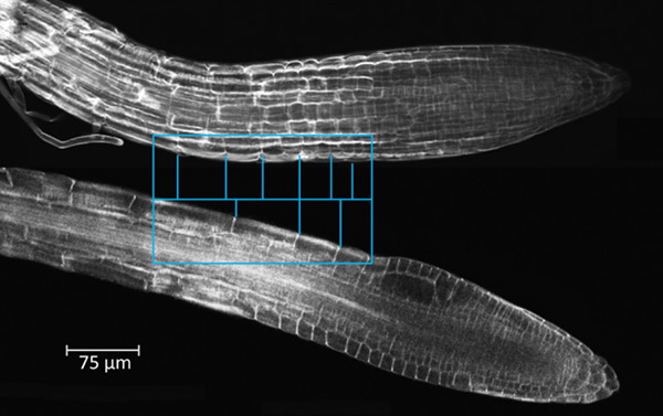 一般的,太空上幼苗会比较小,但是根尖的摆动程度却和地球上的菌株一样。不过,太空植物(如图中上端的植物)的根尖在遇到障碍物从而“歪偏”生长时,其“歪偏”程度却倾向于比地球上的菌株(如图中下端的植物)要大。研究者们称,这很大程度上是由于太空植物的细胞数目更多(细胞边缘都有蓝色标记,可看出细胞大小)。