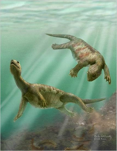 物种进化是非常缓慢的,历经数千年才会产生轻微的变化。生活在2.2亿年前的半甲齿龟仅是一种在水中漂浮游动的食肉性动物。伴随着历史迁移最终进化形成结实坚硬的龟壳。半甲齿龟时常被深海中的生物攻击吞食,尤其是潜藏在水底的掠食者,它们很难对腹部以下的水位进入观察防御,最终身体进化形成一种龟壳,能够有效地保护它的腹部,避免掠食性动物的攻击。