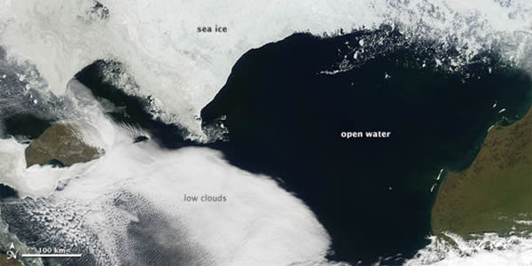 在冬天的大多数日子里,北极圈日照时间很短,有些日子甚至整体见不到太阳,北冰洋大部分海域及其附近陆地都被冰雪覆盖。冰盖之下有大量处于休眠状态下的浮游植物。当天气转暖,日照时间变长,海冰就开始撤退。这时,撤退海冰边缘的海水中的浮游植物结束休眠,开始大量繁殖。上面这两幅卫星观察图显示了北冰洋楚科奇海在2011年7月10日的浮游植物水华。
