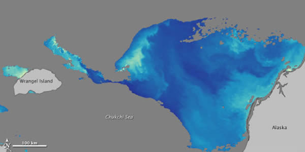 美国国家航空航天局地球观测站(NASA's Earth Observatory)今日公布了一组卫星观测图,展示了北极圈北冰洋楚科奇海(Chukchi Sea)浮游植物大量繁殖形成的藻花。