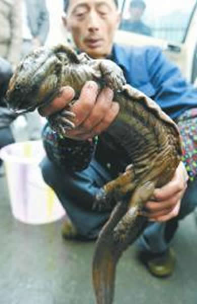 56岁的廖国志是清水河边某工地工人,前晚8点,他在河边逛时,发现河里有一条“怪物”,“黑乎乎的,全身弯曲,貌似大鲶鱼,可仔细看,它又有四只 脚……”随后,廖国志拿网把它救上岸,并装进水桶。不久,“老廖捞到怪物”的消息在工地炸开了锅,工友纷纷来看热闹,“这怪物是蜥蜴吧?”“会不会是新物 种?”