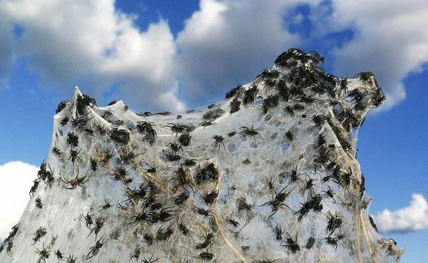 这或许是恐惧蜘蛛症患者的梦魇,今年3月,澳大利亚Wagga Wagga地区蔓延着大量的蜘蛛网,澳大利亚东部经过一个星期的强降雨和洪流侵袭,至少13000人被迫搬离自己的家园,同时大量的蜘蛛也离开了之前的栖息地点。风吹之后大量的蜘蛛网将旋转缠绕在一起,犹如旋转的“蜘蛛网风筝”。