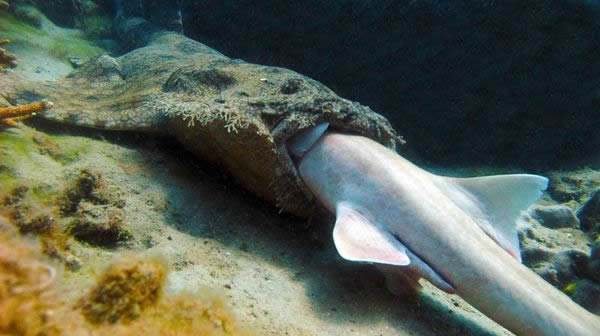 今年2月,澳大利亚珊瑚礁研究中心的丹尼拉-切卡雷利和大卫-威廉姆森在大堡礁拍摄到鲨鱼吞食同类的现象,图像显示一条毯鲨正在整个地吞食一条斑竹鲨。