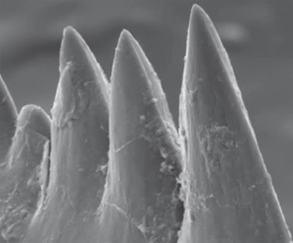 图中是史前鳗鱼牙齿的电子扫描显微图,人类肉眼不可能观看到。目前人类对这种远古鳗鱼的了解并不多,但是知道它们的锋利的牙齿能够很容易切割猎物,庆幸的是这种可怕的鱼类已灭绝很长时间。