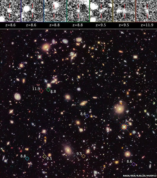天文学家最近用哈勃望远镜捕捉到比以往任何时候都深入的太空图像,通过这些图像天文学家们识别出了由星体组成的六个新星系,这些星体形成于“大爆炸”之后几百万年。另外,天文学家们通过研究还更新了对第七个星系距离的预计值,这使得第七个星系比之前识别出的任何星体都要早。
