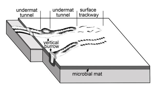 研究发现,同一种两侧对称的后生动物形成了三种形态的遗迹(藻席层下的水平潜穴、沉积物表面的爬迹和垂直于岩层的潜穴),分别反映了不同的行为方式:藻席层之下觅食,沉积物表面爬行以及暂时停息。在埃迪卡拉纪氧含量较低的环境中,藻席层不仅为生物提供了食物,也为生物生存提供了必需的氧供应。研究同时表明了埃迪卡拉纪晚期后生动物已开始了新的生态系统的开拓。
