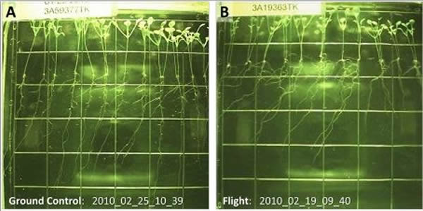 科学家用拟南芥进行试验,对植物生物学家而言,这是一种定位植物。受控组是在肯尼迪航天中心(A)发芽、生长的,而对比组是在国际空间站(B)上。在为期15天内,研究人员每隔6小时给它们拍摄一次照片,并进行对比。他们的研究结果就连他们也感到非常吃惊:置身太空的植物表现出与地球上一样的生长模式。研究人员希望看到两种根生长的特殊模式:波浪形生长和斜移模式。波浪模式是指根尖来来回回生长,很像波浪。当植物的根倾斜,而不是垂直向下生长时,就会发生斜移。科学家并不清楚植物根为什么会发生这种情况,但是他们认为,重力显然是导致两种模式形成的驱动力。