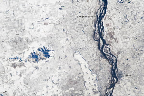 松花江流域是中国东北最主要的农业产区之一,主要农作物是玉米、大豆和高粱。这幅宇航员照片摄于2012年11月18日,突出显示了大雪过后的中国松花江流域数百个矩形农场。由于积雪覆盖不均匀,有些农场比其他其他农场更容易辨认。