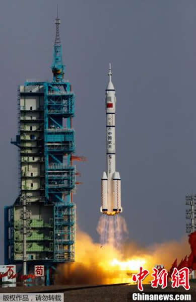 北京时间2012年6月16日傍晚18时37分许,中国“长征二号F”遥九运载火箭在酒泉卫星发射中心载人航天发射场点火起飞,神舟九号载人飞船发射升空。