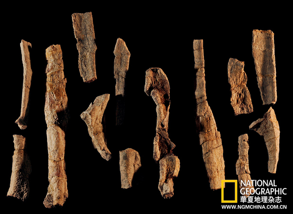 蜥脚类(sauropods)恐龙零散的骨头,大部分是肋骨和脉弧。这只綦江恐龙只保留了脊椎序列,以及不完整的头骨,却没有任何四肢骨,这个有趣的埋藏现象令古生物学家困惑不已。