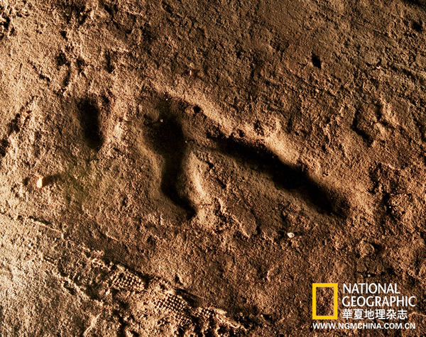 翼龙类后足迹。古生物学家难以根据足迹来判断其主人到底属于哪种具体的恐龙,但因为不同大类的恐龙,其足部骨骼结构有着很大的差异,这些独有的也正总会反映到足迹的形状上。