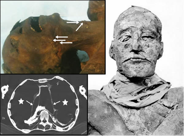 该研究小组分析了两具木乃伊——拉美西斯三世(身上留有亚麻绷带,图右)和在Deir el Bahari发现的之前未确定身份的年轻男子——的DNA样本和电脑断层扫描结果后,得出了这些结论。研究结果表明,这个身份不明的20岁男子(图中箭头指示的是皮肤遭到不同寻常的挤压)是拉美西斯的一个儿子,并且他似乎是被勒死的(扫描发现的胸腔过分膨胀也证明如此),并且以山羊皮陪葬,这种皮毛被古埃及人视为不洁之物,因此适合作为刺客的耻辱标志。看上去君临天下是一项危险的工作。