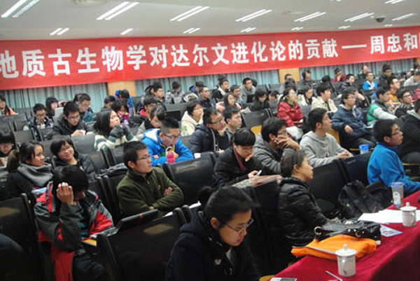 2012年12月18日下午,中国科学院院士、古脊椎动物与古人类研究所周忠和研究员应邀来到了浙江大学紫金港校区蒙民伟楼138厅,为济济一堂的求是学子带来了一场关于地质古生物学的精彩报告-“地质古生物学对达尔文进化论的贡献”。 报告会由浙江省特级专家浙江大学地球科学系杨树锋教授主持。