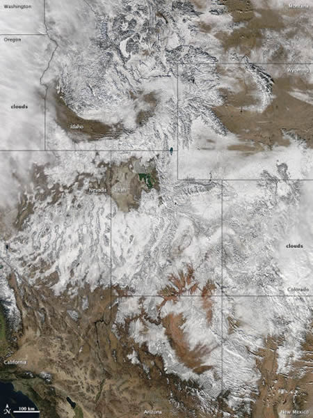 2012年12月19日,美国宇航局的Aqua卫星上的中分辨率成像光谱仪(MODIS)拍下了这幅自然色照片。该地区的云雾大都已经散去,只有一些云团徘徊在太平洋西北上空和科罗拉多州的部分地区。从爱达荷到亚利桑那州,加利福尼亚州到科罗拉多州,积雪覆盖了落基山脉及周边大部分地区,显示出云层更鲜明的轮廓。