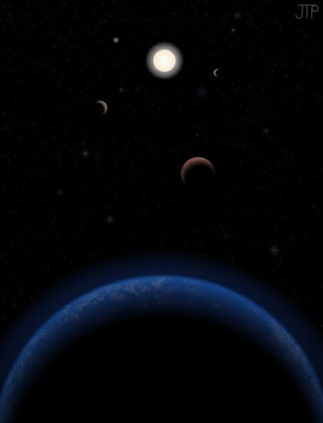 国际天文学家小组发现了一个非常类似太阳系的恒星系统,其中拥有五大行星,更重要的是有一颗行星处于该恒星系统的可居住带上。新发现的恒星系统位于鲸鱼座τ星(Tau Ceti),距离地球大约十二光年,在这个距离上我们可以通过肉眼在黄昏的天空中看见该恒星的光芒,其光谱类似与我们的太阳非常相似,而且也拥有多颗行星,科学家估计它们的质量在两倍至六倍地球质量之间。图1中显示的是艺术家绘制的“小太阳系”恒星系统。