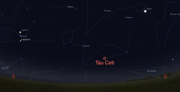 英国哈特菲尔德天空中鲸鱼座τ星的位置,科学家设想未来的望远镜可直接探测到该天体系统中行星大气分子信号