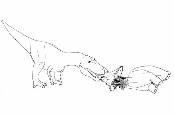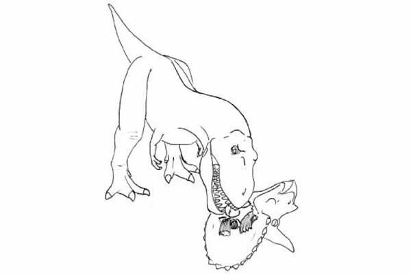 霸王龙和三角龙之间的争斗充满了血腥和暴力。来自美国落基山脉博物馆的科学家对蒙大拿州地狱溪地层的大量三角龙标本进行了研究,确认其中留有的霸王龙齿印。他们发现,没有一副头盖骨有愈合的迹象,表明它们被咬时已经死亡,即是被当做食物吃掉的。而且,一些标本的颈骨边缘存在众多的戳刺和拉扯印记,表明霸王龙在进食的时候,可能会先咬住三角龙的颈部褶边,把头扯下,然后再取食营养丰富的颈部肌肉。有些化石还表明,霸王龙可能喜好撕咬三角龙面部的嫩肉。