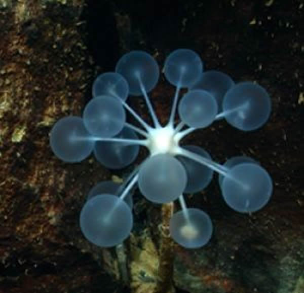 来自蒙特利湾海洋研究所的研究人员在加州北部海域发现了一种新的海绵种类,因其外形酷似竖琴而得名Chondrocladia lyra,意为“竖琴海绵”。竖琴海绵向外伸出的肢体上覆盖着钩刺,用以诱捕小型甲壳类动物,之后它们纤薄的体膜会将猎物包裹起来,然后缓慢地将其消化。科学家认为,竖琴海绵生活在水深3300—3500米左右的海底,它们之所以进化出如此独特的分枝结构,主要是为了增大接触洋流的表面积,更有利于捕捉猎物。