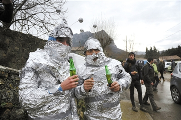 20日,法国,凑“世界末日”热闹的游客打扮成“火星人”。