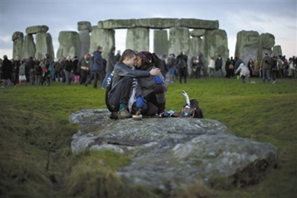 21日,英国南部巨石阵,一些“世界末日”传言爱好者来此祷告。