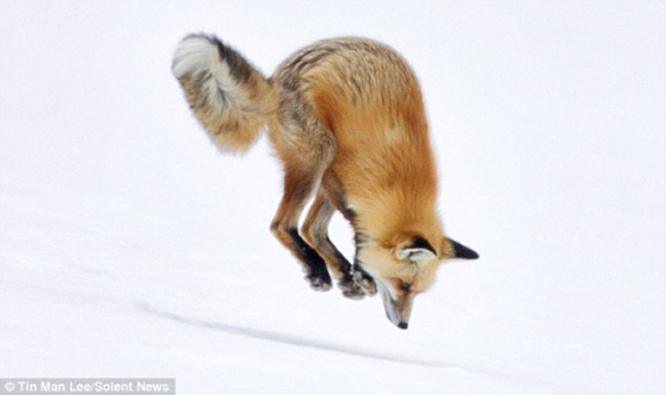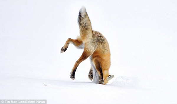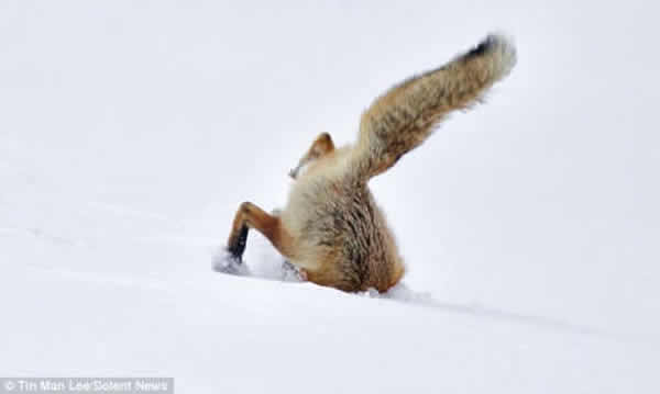 据报道,这只狐狸当时腾空跳跃的高度约有4英尺(约合1.2米),然后直冲而下钻入雪地,捕捉藏匿在雪地里的老鼠。当狐狸钻入雪地后,只有后腿与尾巴露在雪面上。