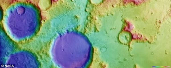 这张火山口色码鸟瞰图展示了火星表面难以想象的环状地貌