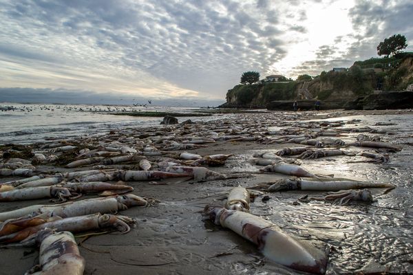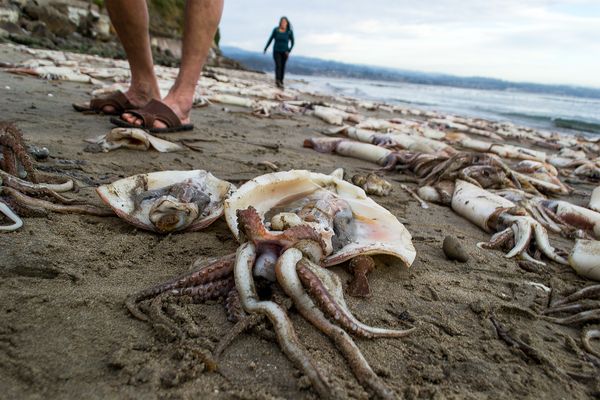 十二月初,在加利福尼亚州的圣克鲁斯,摄影师克里斯·埃蒙赫斯特(Chris Elmenhurst)发现了一个可怕的景象:数以百计的洪堡鱿鱼尸体被海水冲到卡皮托拉海滩上。这是一个几乎与世隔绝的海滩。后来的报道证实,从圣克鲁斯南部到加州中部都出现了这种现象,死亡的鱿鱼总数约有数千。