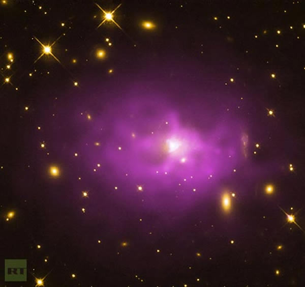 图片中椭圆星系中心的亮点是宇宙中质量最大的黑洞之一,其位置距地球13亿光年