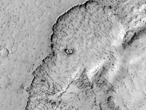 科学家通过火星轨道探测器拍摄到一个酷似大象的地形,该图案其实是由火星上年代较近的岩流所形成,其遍及的范围较广,曾有研究人员提出这一地形的形成说明火星上存在液态水。