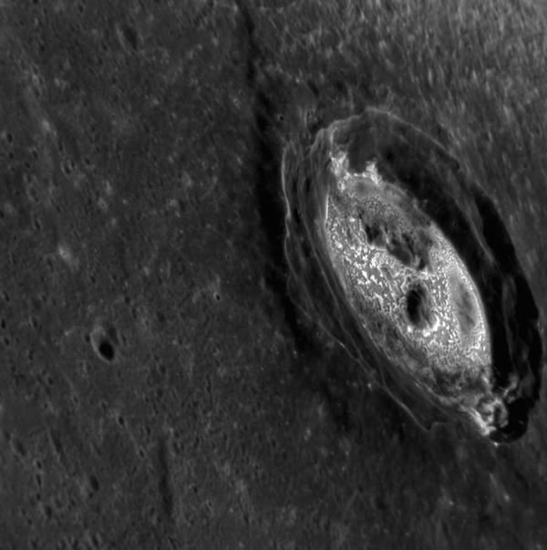 图中的环形山酷似大型怪物留下的足迹,当然这只是水星上一个年轻的陨石坑,科学家对水星表面进行高分辨率的扫描有助于了解这颗星球的地质演变过程。